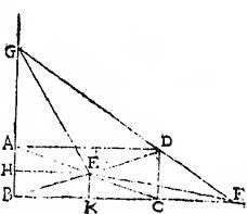 Ducantur enim EH, EK perpendiculares ad AB, BC; eritque per sextam secundi Euclidis rectangulum BF, FC cum quadrato KC sumptum aequale quadrato KF; commune ponatur quadratum EK. Eritque rectangulum BF, FC cum quadrato KC, et quadrato KE, hoc est cum quadrato EC sumptum aequale quadrato KF, cum quadrato EK, hoc est quadrato EF. Similiter omnino demonstrabimus, quod rectangulum BG, GA, cum quadrato EA sumptum, aequale est quadrato EG: aequalia vero sunt per hypotesim quadrata EF, EG: igitur rectangulum BFC cum quadrato EC aequal est rectangulo BGA cum quadrato EA. Item quadrata EC, et EA sunt aequalia quoniam dimidiis eiusdem AC lineae debentur; supe[S:15]rerunt ergo rectangulum BF, FC et rectangulum BG, GA inter se aequalia. Quare per 15. sexti Euclidis, sicut BG ad BF, sic FC ad GA. Et propter similitudinem, triangulorum GBF, DCF, sicut DC, hoc est, AB ad CF, sic FC, ad GA. Item propter similitudinem triangulorum GAD, DCF, sicut DC, ad CF, sic GA, ad AD, hoc est ad BC. Itaque quatuor lineae AB, CF, GA, BC sunt continuae proportionales. Et hoc proponebatur demonstrandum.