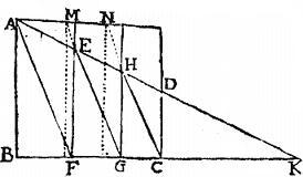 Sint datae rectae lineae AB, et CD, et intra parallelogrammata rectangula inter se aequalia, et similia, quorum maiora latera aequalia sint AB maiori datarum; [S:17] disponendaque sunt parallelogrammata in eodem plano, ut eorum bases minores super eadem recta BK iaceant, et eorum diametri, aequidistent inter se, et fixo manente parallelogrammo medio compellatur unum supra, alterum infra eundem, aptata in eodem plano; quousque puncta A, E, H extrema diametrorum, in una recta linea AK cadant; quae praeterea cum recta BK, extremi parallelogrammi lateris portionem CD abscindat aequalem minori datarum.