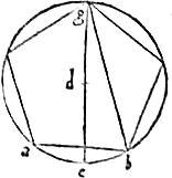 30 74 Quadrata, quod a latere pentagoni, quodque ex eius angulum subtendente, simul sumpta, quincuplum sunt quadrati, quod ex circuli pentagonum circumscribentis semidiametro. Sit ab latus pentagoni be latus decagoni, bc subtendens angulum pentagoni cde diameter circuli abc centrum autem d. Aio, quod quadrata linearum ab, bc simul quincuplum faciunt quadrati de8 vel cd. Quod sic ostenditur.